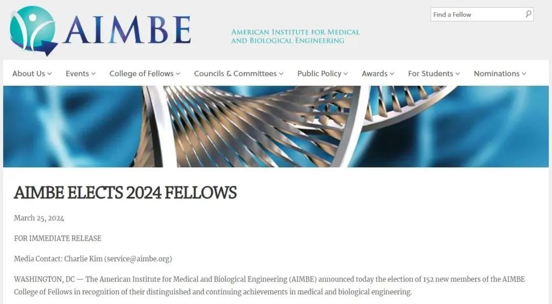 近日,美国医学与生物工程院(AIMBE,The American Institute for Medical and Biological Engineering)官网发布消息,2024 年度新选举产生 152 位美国医学与生物工程院 Fellow,以表彰他们在医学与生物工程方面取得的卓越成就。