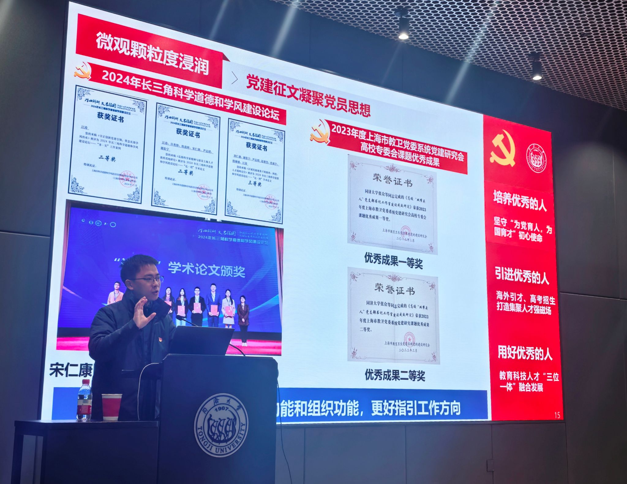 全国高校“双带头人”教师党支部书记“强国行”专项行动团队、物理科学与工程学院师生混合第十党支部书记江涛教授以高质量党建推动高质量发展为主题分享了全国样板党支部的建设经验,围绕宏观和微观两层颗粒度,分别阐述了党建工作如何与团队发展和师生发展协同共进。一是以宏观颗粒度引领,增强全局发展意识,促进支部建设与科研团队共同发展,支部坚持四个面向,积极建设科研平台,凝聚全员育人力量,全方位助力学生培养。二是以微观颗粒度浸润,以一流党建引领师生发展,推动教师党员发展和学生党员发展“同规划、同部署、同推进”;聚焦教育、科技、人才“三位一体”协同融合发展,围绕学生思政和青年发展,着力引进优秀的人、用好优秀的人、培养优秀的人。