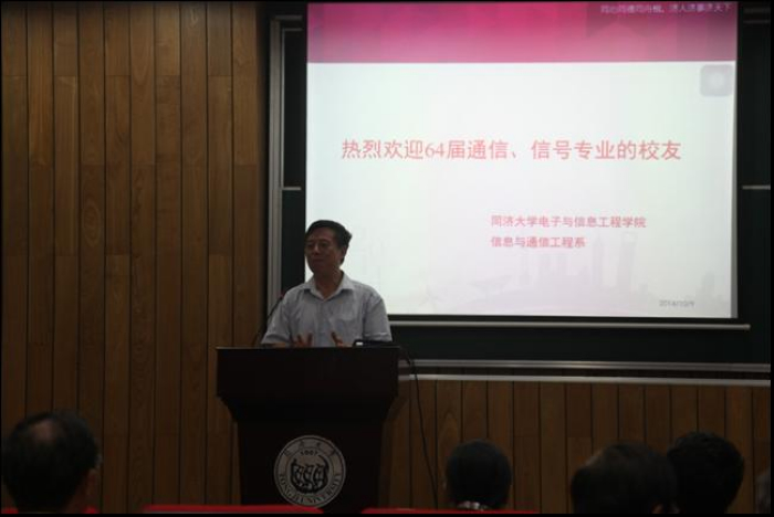 通信工程教研室主任薛小平教授向校友们详细介绍了学校、学院及信通系的情况,着重介绍了面向交通领域的通信与信息关键技术研究,包括轨道交通、地面交通及海洋通信的研究方向及取得的成果。