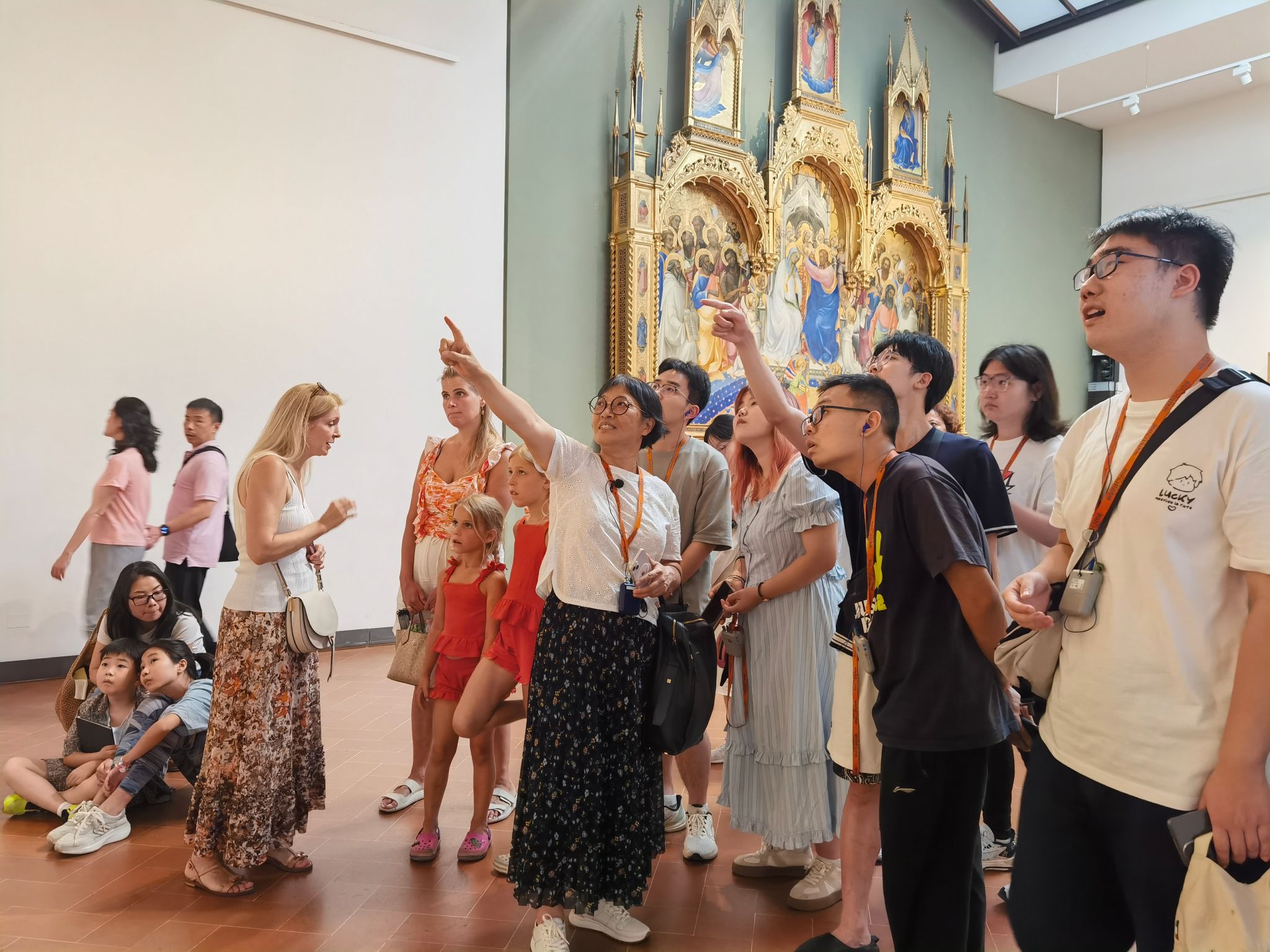 在佛罗伦萨,师生代表团跟随着意大利向导进行了一场别开生面的city walk。穿行在佛罗伦萨的街道,师生代表团体验了一场美妙的历史与艺术之旅。一路上建筑古迹庄严宏伟,让人印象深刻。在这里,大家体会到了建筑艺术的力量,它不仅仅是供人欣赏的美丽外壳,更是历史、文化和智慧的结晶。此外,在佛罗伦萨大学教授的带领下,同学们分批进入乌菲齐美术馆观摩学习,乌菲齐美术馆位于阿尔诺河畔,收藏了大量珍贵的文艺复兴时期艺术品。通过两位老师的讲解,同学们不仅欣赏到了这些伟大画作的艺术之美,还深入了解了文艺复兴时期的历史背景,跟随艺术家们对人类自身、自然与世界文明进行深刻思考。