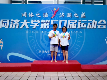 教师发挥出色,邹红艳老师蝉联女子46岁以上组50米蛙泳冠军,王俊凯老师获得男子35岁及以下组50米蛙泳亚军。