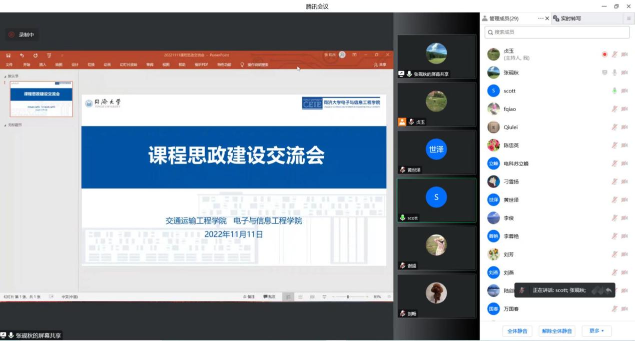 教师课程思政意识和教学能力。2022年11月11日下午,学院特邀交通学院课程思政中心副主任黄世泽老师、课程思政示范课程团队谢超老师,与电信学院课程思政建设项目的成员开展了线上交流会。会议由学院研工办主任张砚秋主持,近40名教师参加了此次交流活动。