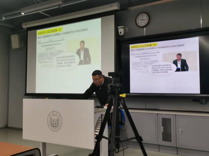 在A/D转换器方面有突出成就的吴江枫和余有灵两位老师,并将他们在该领域的科研成果展示给学生。吴江枫老师长期从事集成电路工艺研究,他与余有灵老师于2017年一起研发出55nm的高速A/D转换电路,为我国集成电路发展做出巨大贡献。