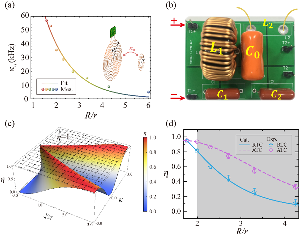 图2:(a)旁路电容作为“合成维度”构造的反共振线圈与普通共振线圈的耦合强度;(b)构造反共振线圈用的电路板;(c)基于“能级钉扎”效应的稳定且高效的无线电能传输;(d)固定频率下“反共振-共振”构型与传统“共振-共振”构型传输效率对比。