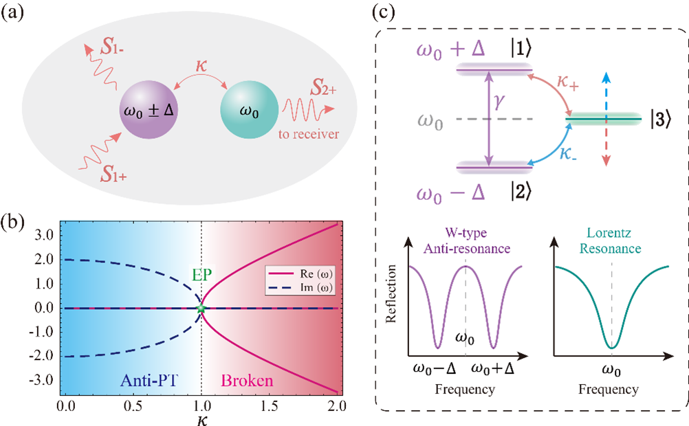 图1:(a)反共振-共振模式耦合模型图;(b)反共振-共振模式耦合构造三阶Anti-PT对称的相图; (c)反共振-共振模式耦合产生“能级钉扎”效应的能级示意图。