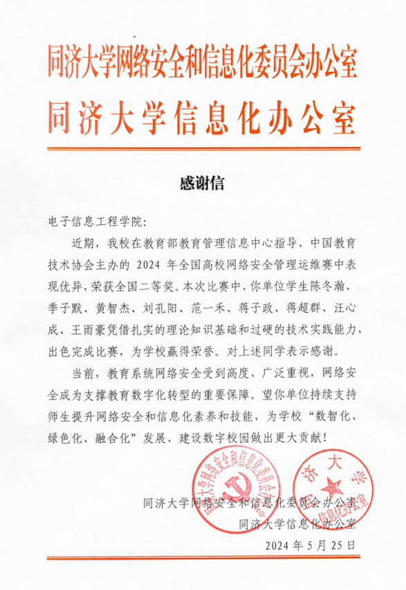 赛后,学院收到了来自学校网络安全和信息化委员会办公室、信息化办公室发来的感谢信,感谢参赛队员的出色发挥,凭借扎实的理论知识基础和过硬的技术实践能力,为学校赢得了荣誉。