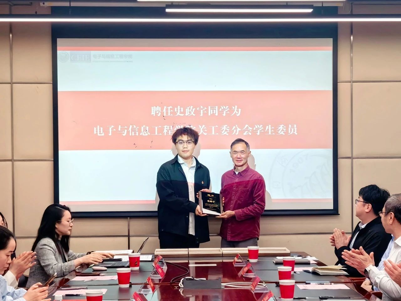 为更好搭建青年学子与“五老”之间的沟通桥梁,聘任2024级控制科学与工程专业硕士研究生史政宇为学院关工委新一任学生委员。学院关工委委员胡宗福为其颁发聘书。