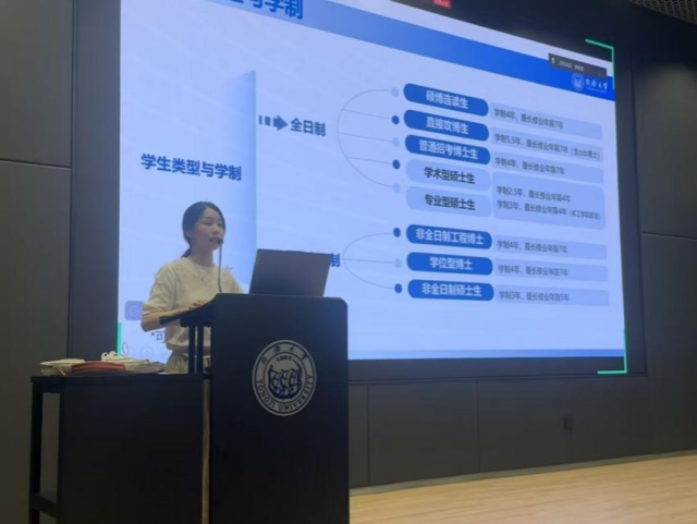 最后,张云霞老师重点讲解了不同类别硕博生在学制内各个关键环节的任务及时间安排,并对各位新生寄予殷切期望,希望同学们能够合理规划研究生生涯,在潜心科研的同时,也能充分享受校园生活。