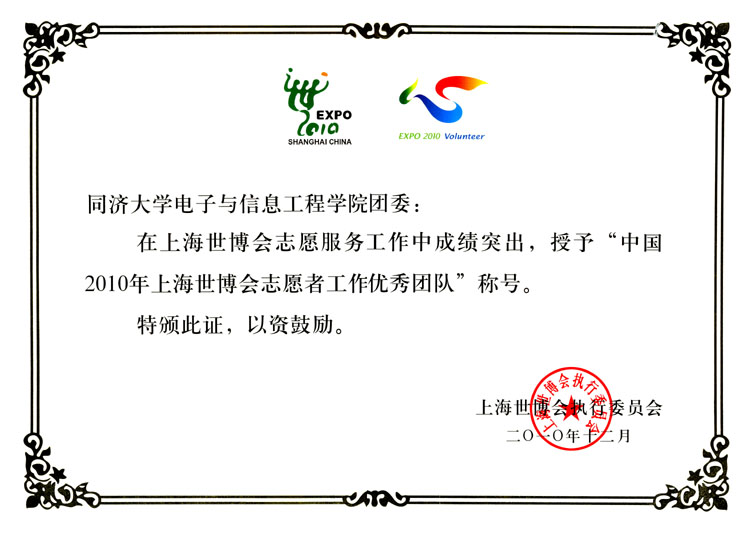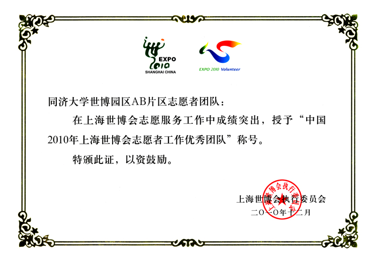 志愿者所在AB片区志愿者团队两个单位均获“上海世博会工作优秀团队”称号,(全校共有6个团队获此荣誉);程 莉获上海市“创先争优,世博先锋行动”“五带头”共产党员称号;唐志宇获上海市教卫“世博先锋行动”优秀共产党员称号;刘永焕、程 莉、唐志宇、曹 阳、印海文、于 淼、冯怡然、何 伟、黄黎华、居征宇、李铭洋、李维丹、林显琦、田正之、闫明皓等15人分获“上海市优秀志愿者”荣誉。