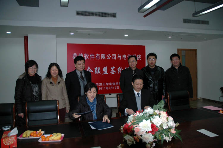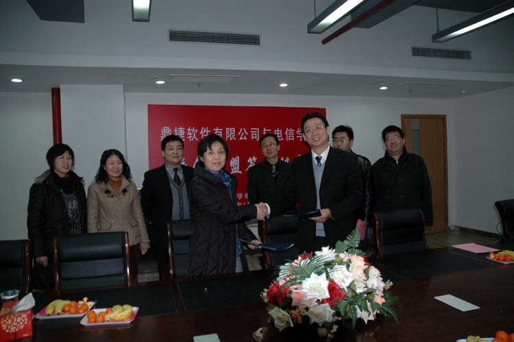 签字仪式上,鼎捷软件有限公司副总裁潘东和副院长乔非作为双方代表在协议上签字并合影留念。