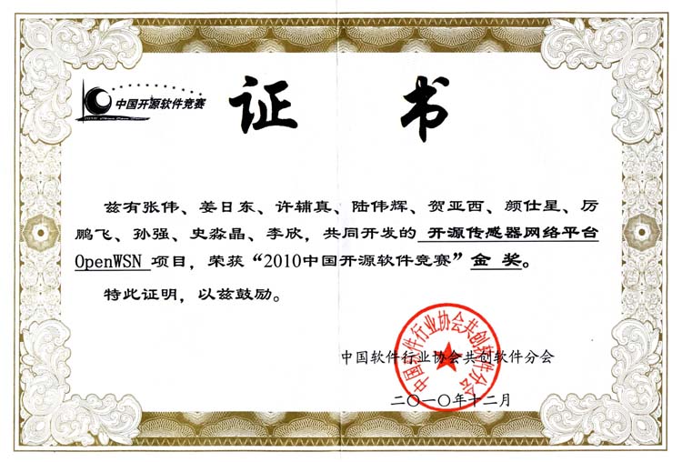 控制系张伟老师负责设计指导,学生姜日东、许辅真、陆伟辉、贺亚西、颜仕星、厉鹏飞、孙强、史淼晶和李欣参与创作的送赛作品“开源传感器网络平台OpenWSN”软件,以第1名的成绩获得大赛唯一的金奖。