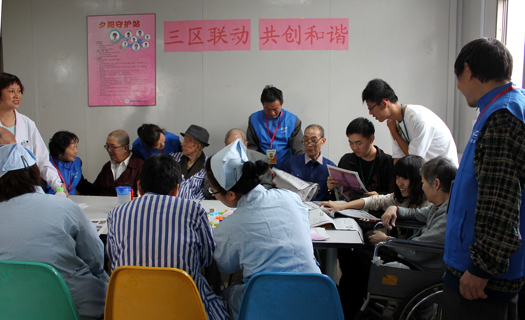 大学生志愿者与平凉路街道的社区志愿者,一同前往了位于许昌路上的沪东老年护理院,开展“三区联动 共创和谐”活动。