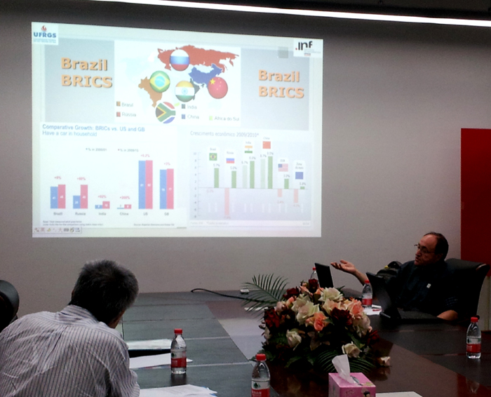 会上,Dante Barone教授从经济、教育、科研等方面介绍了巴西以及南里奥格兰德州的情况,并介绍了南里奥格兰德联邦大学以及信息学院的科研、国际合作办学的情况;苗夺谦副院长和关佶红教授分别向Dante Barone教授介绍了学院以及计算机科学与技术系的教学、学科与国际合作办学情况。
