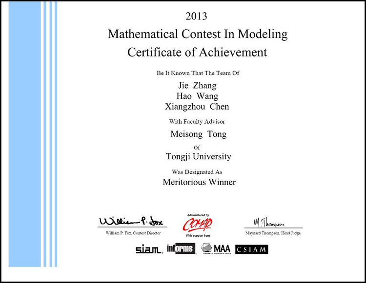电子科学与技术系3位2010级本科生张杰、王浩、陈翔舟共同完成的参赛论文《The Water Strategy for China’s Future》喜获数学建模竞赛一等奖(Meritorious Winner)。