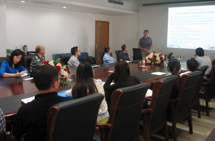 师生作了题为“Space charge distribution measurement in thin film dielectrics and semiconductors”的学术报告。他对如何准确测量薄膜电介质和半导体的空间电荷分布,从理论推导到实际测量作了精彩详细的讲解。报告结束后,Stéphane Holé教授与西瓜视频