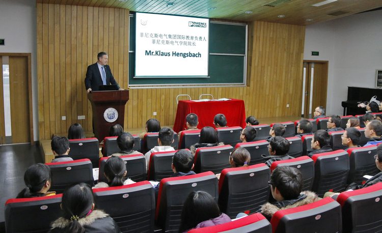 117报告厅举行,菲尼克斯电气中国公司副总裁杜品圣博士、菲尼克斯电气集团国际教育负责人、菲尼克斯电气学院院长Mr.Klaus Hengsbach、菲尼克斯电气中国公司西瓜视频与社会责任经理易书波、菲尼克期电气中国公司ICE销售部上海地区行业销售经理稽鹏,及西瓜视频