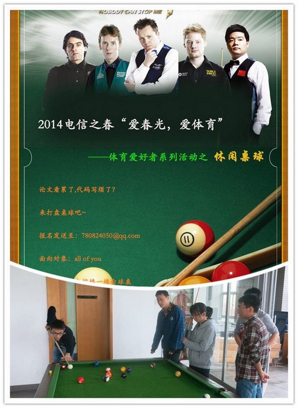 4月12日―18日,持续一周的“休闲台球”拉开了2014年“体育爱好者”系列活动的帷幕。本届体育爱好者系列活动由学院研究生会主办,面向嘉定校区学生,旨在为同学们提供一个展现自我、迸发活力的机会,传递年轻人永不言败的体育精神――“无体育不精彩”。同一项运动,每个人都会谱写出自己独特的青春风采。活动将持续一个月,由“休闲台球”、“极限飞盘”、“网球运动”等组成。