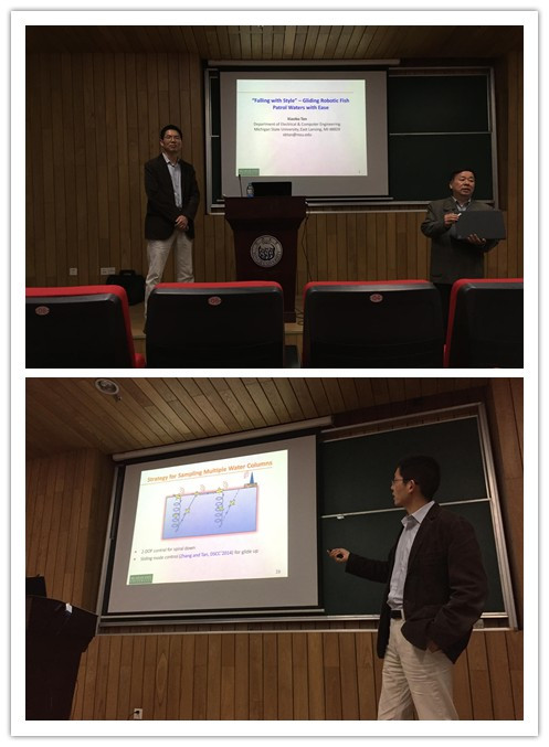 师生们作了题为“Falling with Style― Gliding Robotic Fish Patrol Waters with Ease”的学术报告。该报告主要讨论了新的水下机器人的类型――“gliding robotic fish”。