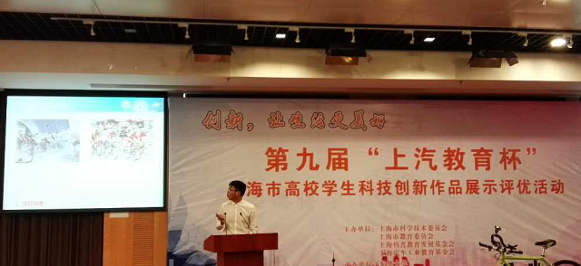 “上汽教育杯”上海市高校学生科技创新作品展示评优活动由上海科普教育发展基金会、上海汽车工业教育基金会主办。上海市27所高校共申报学生作品257件,在终评答辩环节中,孙路同学就作品的设计理念、设计过程、设计结果和应用前景等进行了全面阐述,得到了专家的一致好评。经与会专家评审讨论,该团队的作品《基于数据驱动及虚拟竞技的骑行健身训练系统》获得本次大赛的一等奖。