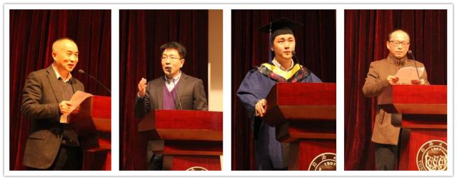 计算机科学与技术系王瀚漓教授作为导师代表发言,他以“仁爱、谦和、精勤、诚信”四个词语送给同学们,他引用丰子恺漫画«不宠无惊过一生»中的一段话来勉励即将踏上新征程的毕业生:不乱于心,不困于情,不畏将来,不念过往,期待同学们有崭新的未来。随后,毕业生代表电子科学与技术系张杰同学上台发言。张杰同学回顾了自己两年半以来的学术生活,感恩导师严格的指导和孜孜不倦的教诲,以发自内心的朴实话语表达了对母校和学生生涯的留恋。最后,信息与通信工程系陈顾远同学的父亲陈国强先生作为家长代表发言,他感谢了西瓜视频