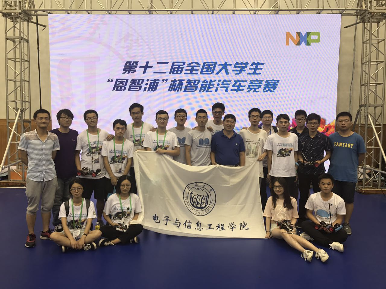 同学由控制系朱劲老师和张志明老师带队,经过一年的认真实践和三个月的紧张备战,在比赛中沉着应对,稳定发挥,最终再创佳绩。由陈浩、钟政、黄映三位同学组成的“奇哥带队”取得光电四轮组一等奖;由石文博、孙晓娴、钟献有三位同学组成的“浩哥带队”取得光电直立组一等奖;由李若白、马绮铭、应旻婕三位同学组成的“树哥带队”取得电磁节能组一等奖;由寿佳鑫、哈星伯、唐亮、方堃四位同学组成的“小德带队”取得双车追逐组三等奖。