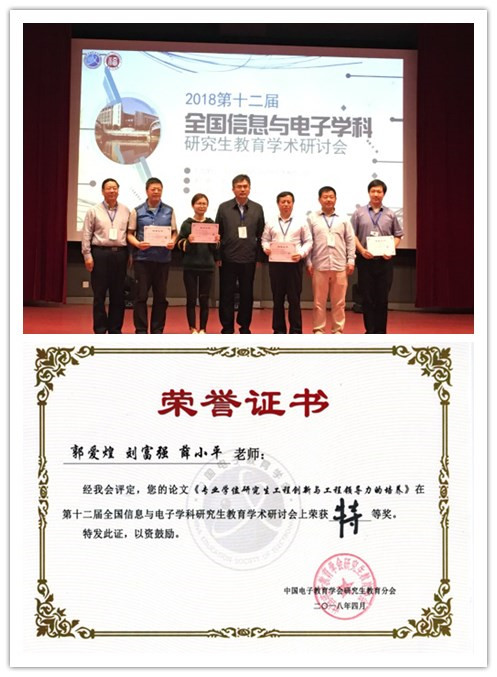 信息与通信工程系郭爱煌教授参加了会议,并在学术研讨分会场对由其和薛小平教授、刘富强教授共同撰写的投稿论文《专业学位研究生工程创新与工程领导力的培养》做了报告,经与会专家评议,该论文获得特等奖。中国电子教育学会研究生教育分会会长吴一戎院士和评委专家为其颁奖。