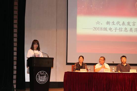 信息与通信工程系薛小平教授作为教师代表欢迎新生们的到来,希望新生能够尽快适应大学生活并实现自己的梦想,对全体新生表示真诚的期望,期望它们要树立远大的理想,学会做人、学会求知,学会生存、学会协作、学会健体、自尊自爱、自律自强,养成良好的学习习惯,良好的行为习惯,良好的生活习惯,努力走向成功、走向辉煌!