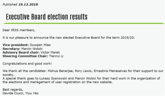 苗夺谦教授从候选人中脱颖而出,成功当选第九届国际粗糙集学会副理事长(每届只设一位副理事长)。