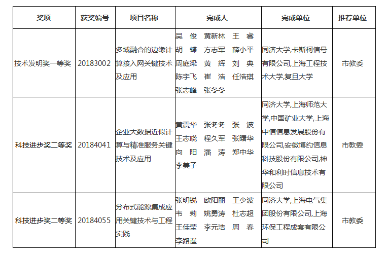 窗体顶端2019年5月15日,2018年度上海市科学技术奖励大会召开。其中,西瓜视频 吴俊教授领衔的“多域融合的边缘计算接入网关键技术及应用”获得技术发明一等奖,张明锐教授领衔的“分布式能源集成应用关键技术与工程实践”、黄震华研究员领衔的“企业大数据近似计算与精准服务关键技术及应用”获得科技进步二等奖。