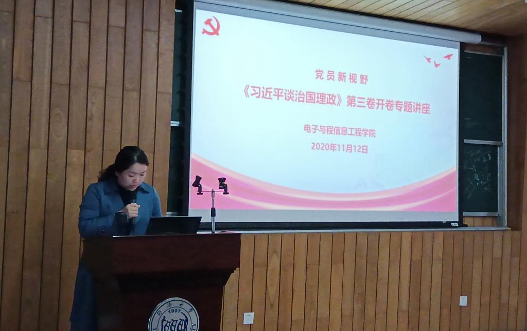 2020年11月12日下午,学院邀请马克思主义学院的刘骞副教授在智信馆117报告厅开展题为《新时代背景下建设中国特色社会主义的战略目标和内容》的党员新视野专题党课,带领学生党员和入党积极分子进行《习近平谈治国理政》第三卷的开卷学习,引导大家通过读原著、学原文、悟原理,努力做到学、思、用贯通,知、信、行统一。专题党课由学院党委副书记张南华老师主持,计算机联合党总支副书记张砚秋、学生党总支副书记刘永焕、学院全体辅导员、学生党员以及入党积极分子150余人参加。