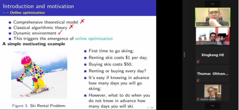 李修贤研究员作题为“Distributed Online Optimization Over Directed Networks with Coupled Inequality Constraints”的报告,考虑实际复杂约束,提出改进的分布式原始对偶算法并建立动态遗憾上界的理论分析。