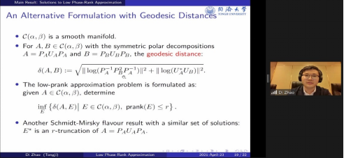 的赵迪助理教授作题为“A Low Phase-Rank Approximation Problem”的报告,研究低秩逼近算法,可有效应于模型简化,信号处理等问题。