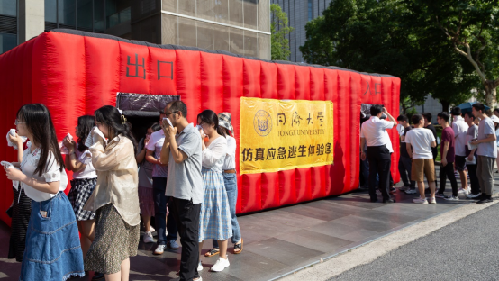 警报拉响后,楼内师生在疏散引导人员的引导下,通过安全楼道有序疏散撤离,到达指定地点集合。来自学校保卫处的专家对师生进行了消防安全、火场逃生及灭火演练培训。最后,师生进入仿真灭火移动体验馆和仿真应急逃生体验馆进行灭火和逃生体验。