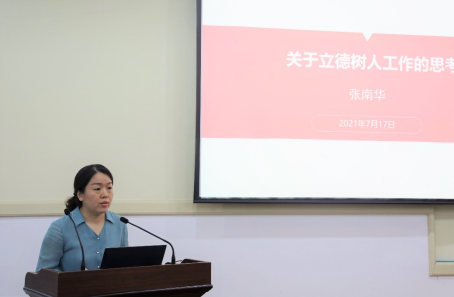 学院党委副书记张南华首先作“关于立德树人工作的思考”的主题发言。她围绕构建本研一体化思政格局、推进“三全育人”工作等方面进行了学院相关工作的现状分析与问题查摆,并提出了“建设学院的学生事务中心”、“搭建学生成长大数据平台”等多项深化协同育人工作的设想。