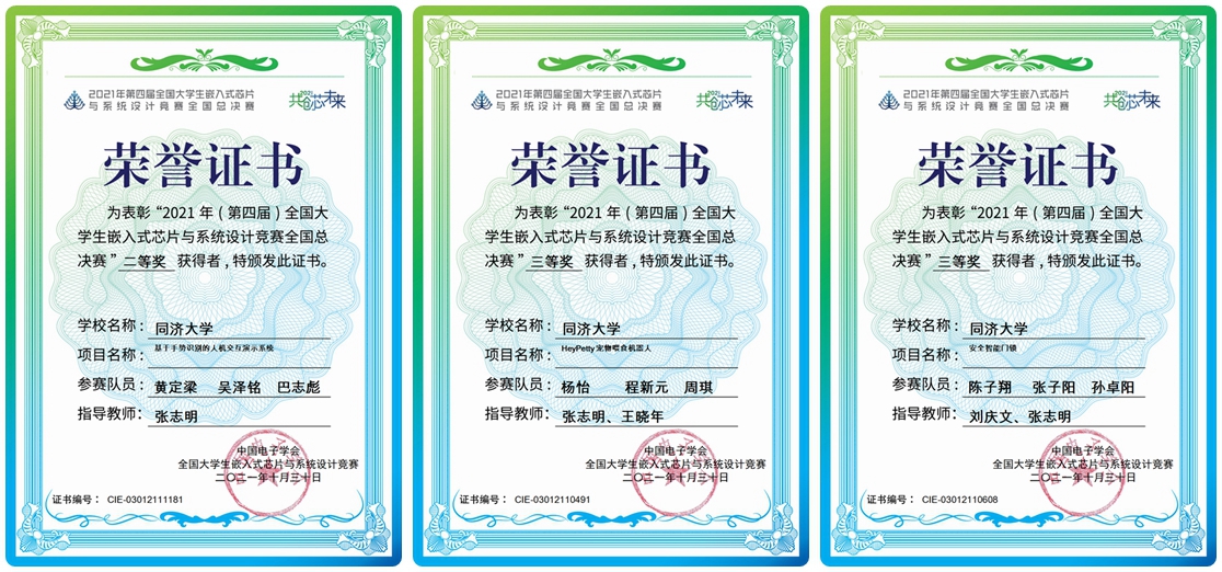 控制系教师张志明指导,自动化专业的黄定梁、吴泽铭、巴志彪组成的“两片面包夹芝士”队获应用赛道ST赛题全国二等奖1项;计算机系刘庆文、控制系张志明指导,信息安全专业的陈子翔、张子阳、孙卓阳同学组成的“CPU写的都队”队、控制系张志明、王晓年指导,杨怡(自动化)、程新元(计算机科学与技术)、周琪(电子信息)组成的“百事可乐”队获得应用赛道海思赛题全国三等奖2项。同时,这3支队伍9名队员已在先期举办的东部赛区比赛中获得一等奖。除此之外,东部赛区另有2支队伍6名队员获得二等奖,6支队伍18名队员获得三等奖。