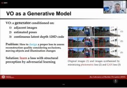 查红彬教授分别从SLAM的概念、研究进程、关键问题以及在线学习方案等方面展开报告。首先,查教授介绍了SLAM中定位与建图的耦合关系,并表示同步定位与建图是人类动态视觉系统的一个基本功能。然后介绍了SLAM研究的历史发展及一些相关的算法,详细分析目前SLAM算法的一些不足并指出关键问题是系统性表述的缺乏。接着介绍了传感器数据流的关键概念、预测器和地图的相关概念和在线学习方案。查教授还介绍了所在团队与SLAM相关的一些研究。最后详细地介绍了一项其团队的近期研究工作,是基于序贯对抗学习的自监督深度视觉测距,包括视觉测距的背景、基于学习的方法、存在的挑战以及该工作主要贡献和实验结果等。查教授丰富精彩的报告为学校师生的学习和科研工作带去了思想启发,也为同学们学习动态视觉与SLAM提供了有益指导。