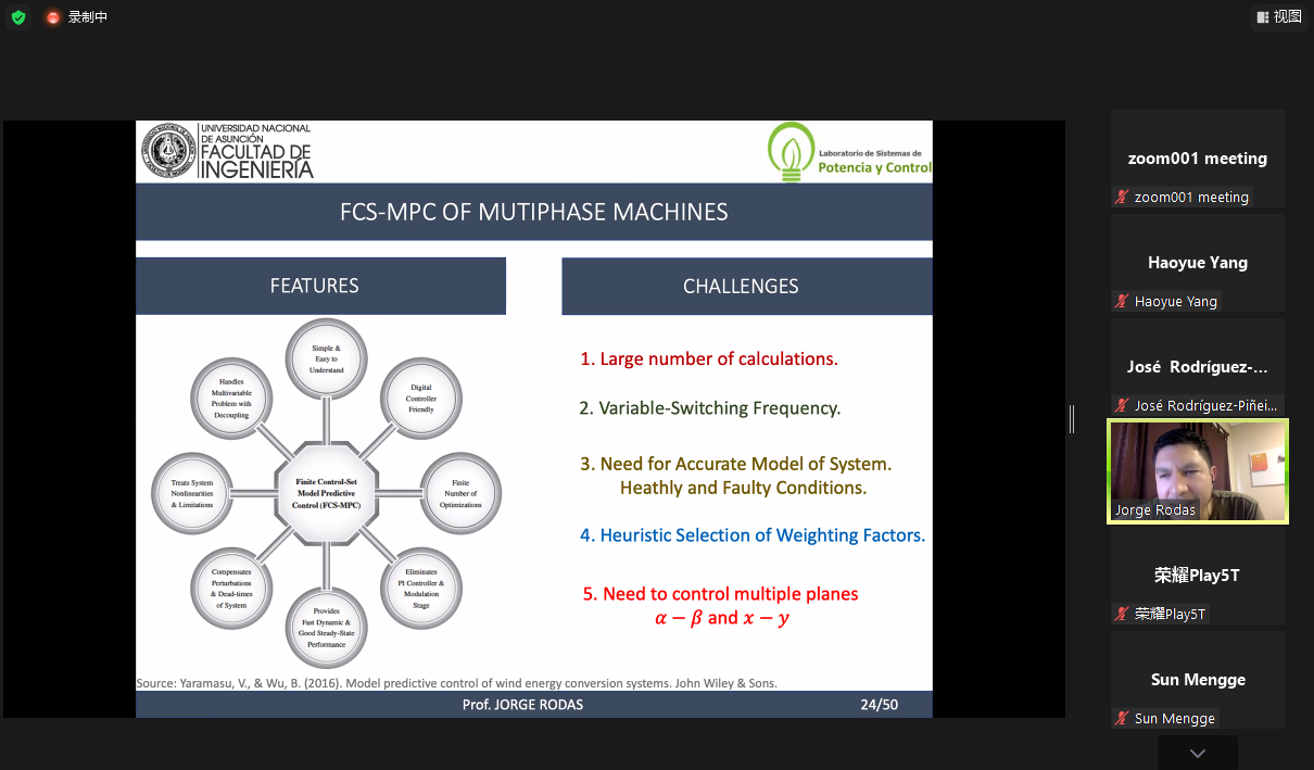 报告结束后,Jorge Rodas教授就模型预测控制相关的问题与师生们进行了交流。他也根据自身经历勉励同学们要积极拓宽视野,努力探索、发现并解决新的科学问题。此次报告进一步拓展了我校师生的视野,增强了对模型预测控制及多相电机的理解与认识。(文/图 张皓 王云姣)
