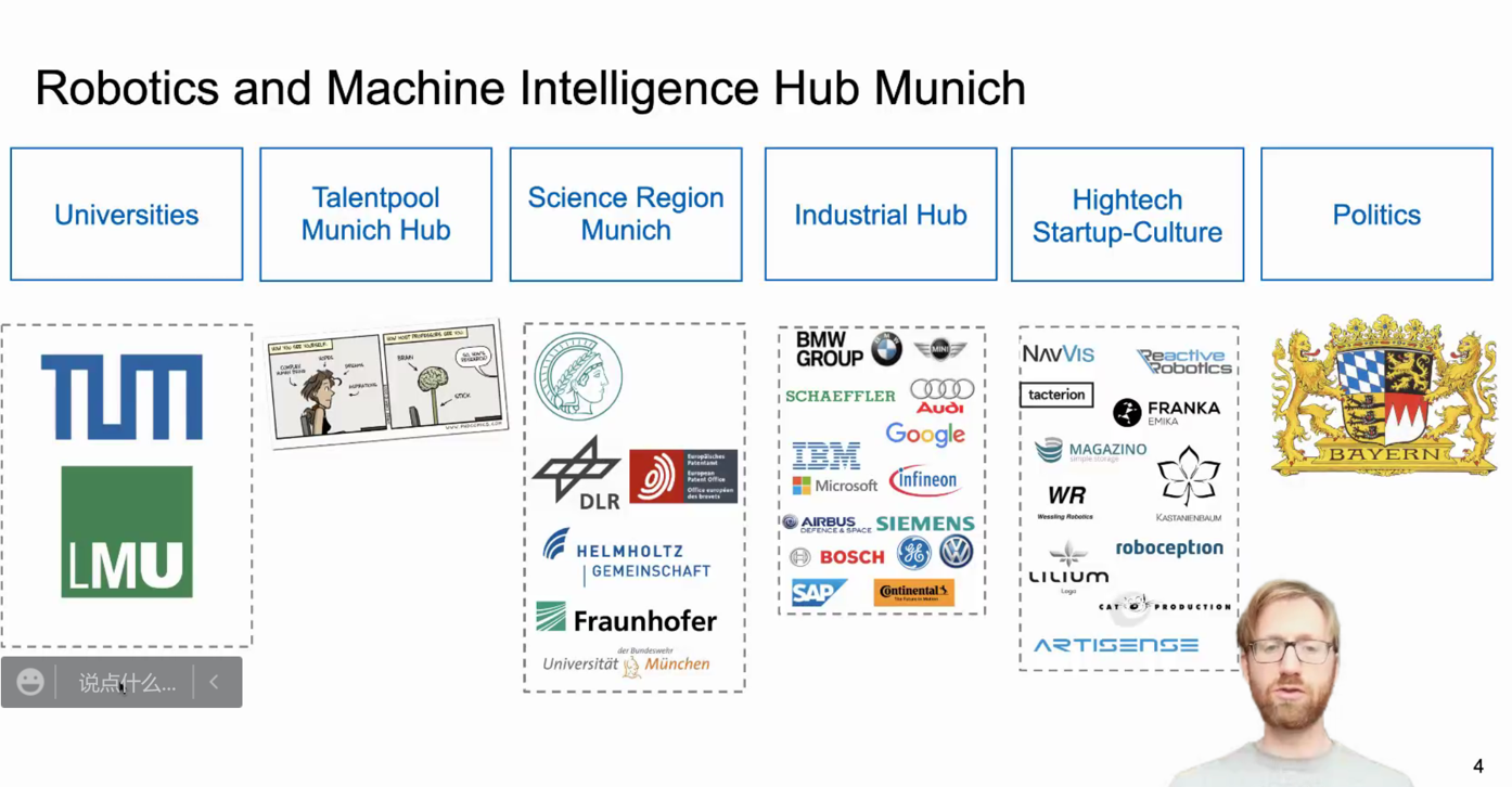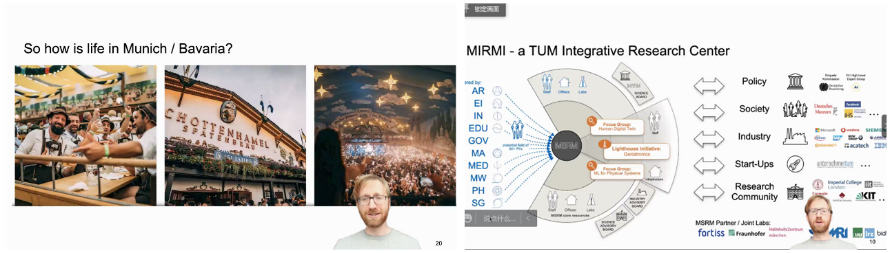 担任中德智能科学与技术研究中心德方副主任。他在报告中介绍了德国科研资助的等级、政府关注内容、慕尼黑工业大学在机器人与人工智能方向上的实验室、研究方向、未来发展、校园文化及巴伐利亚文化。