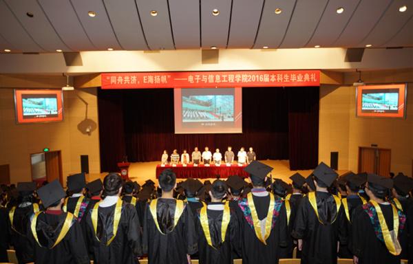 2016届本科生“同舟共济,E海扬帆”毕业典礼在嘉定校区济人楼101报告厅隆重举行。我校副校长蔡达峰、校团委副书记崔莹,学院相关领导、教师代表、家长代表以及300余名应届毕业生出席了毕业典礼。大会由学院党委书记童学锋主持。