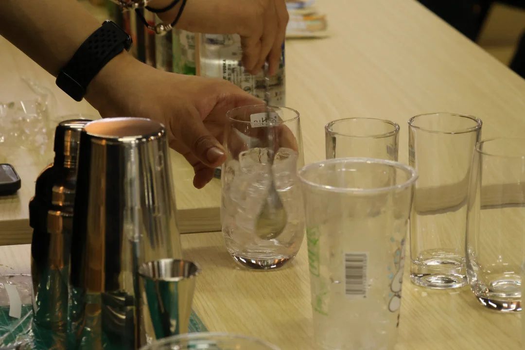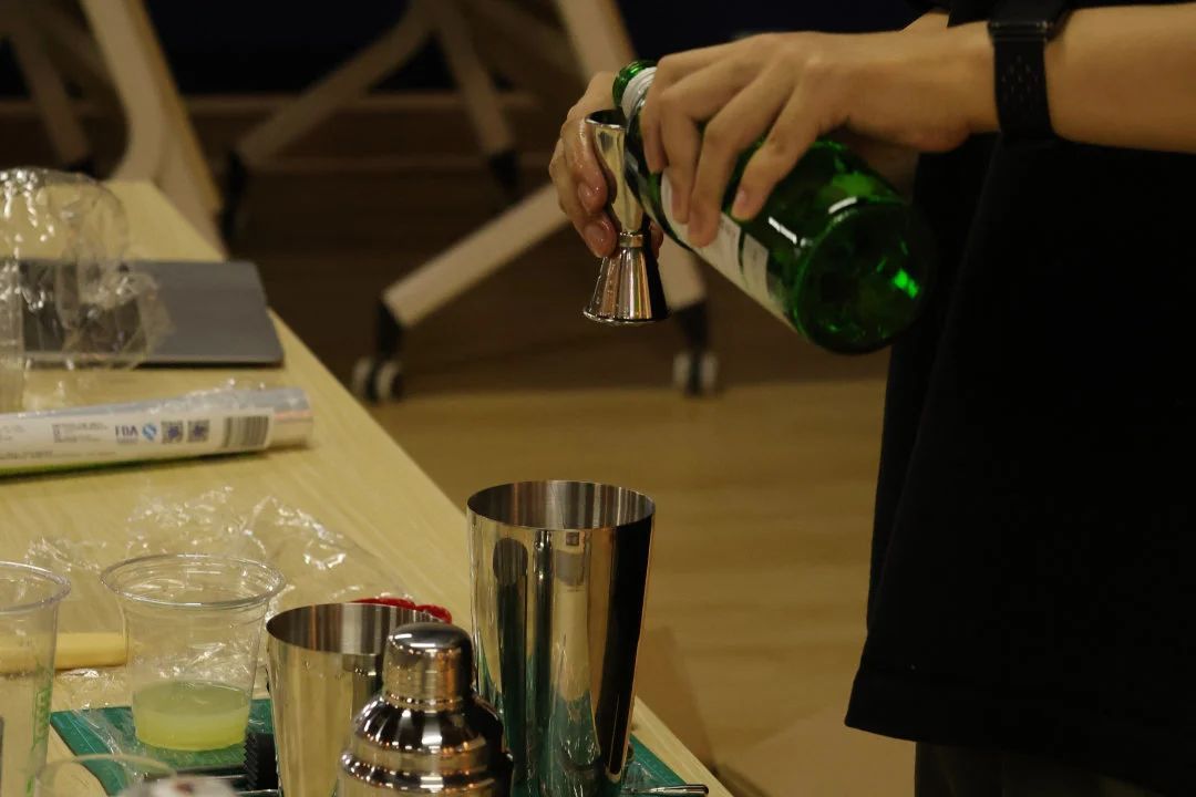 随后,调酒师调制了两款常见的鸡尾酒,以此来向同学们展示调酒中会用到的“shake”“stir”等调酒技巧,并细心地为同学们讲解要特别注意的事项。现场的同学近距离感受调制好的的饮品的香气和色彩。之后,同学们也积极来到调酒师的旁边,在调酒师的指导与建议下,运用刚刚学到的一些技艺,开始尝试调制无酒精饮品。