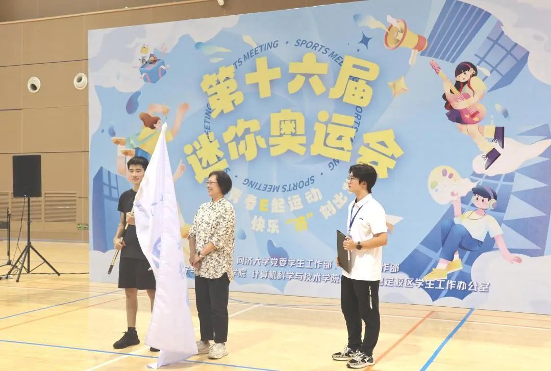 接下来分别由裁判员代表和运动员代表进行宣誓。嘉定校区管理委员会办公室副主任倪净老师为运动员代表庄重授旗,标志着本届迷你奥运会正式拉开序幕。
