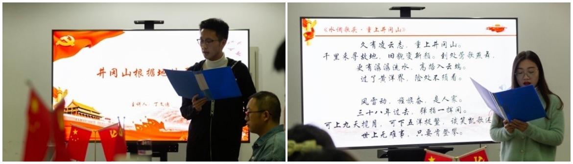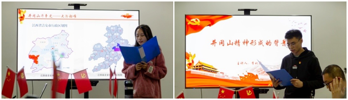 此次主题党日活动分为“回望”、“斗争”和“传承”三个篇章。在“回望”部分,俞昊同志从当时政治环境和社会背景出发,总结出“井冈山能够成为根据地并非偶然,而是历史原因与客观因素的共同作用”的结论;肖云鹏同志介绍了“秋收起义”这一重要历史事件,提出其意义不仅在于为农村包围城市革命道路进行初步探索和实践,也为井冈山根据地的诞生埋下了伏笔;丁文迪同志则通过井冈山根据地开辟和朱毛会师的历史展现了老一辈革命家的优良作风和革命精神。