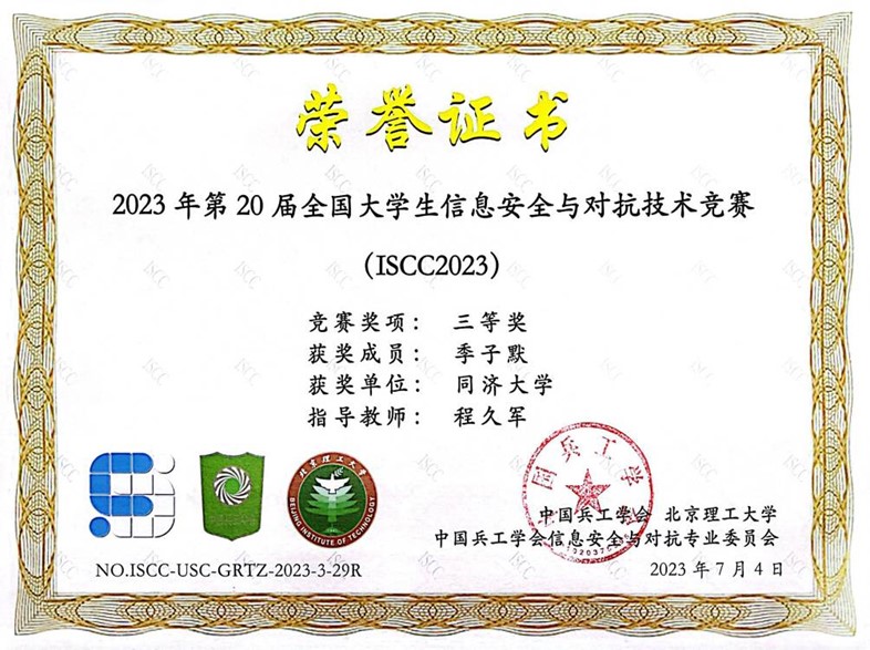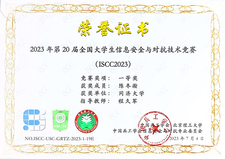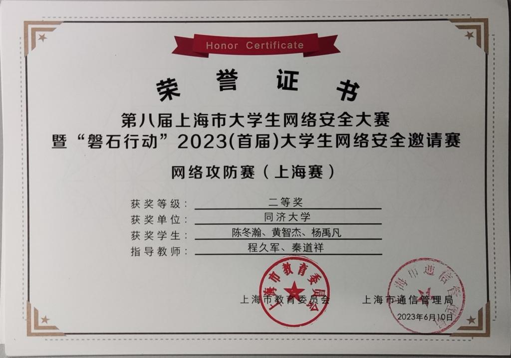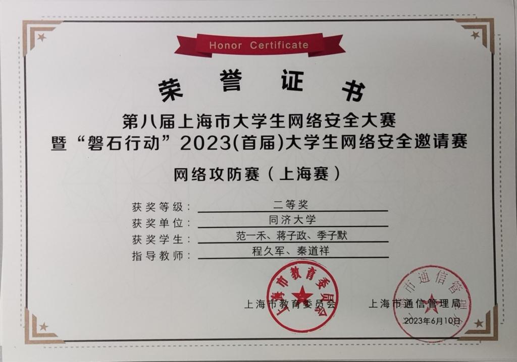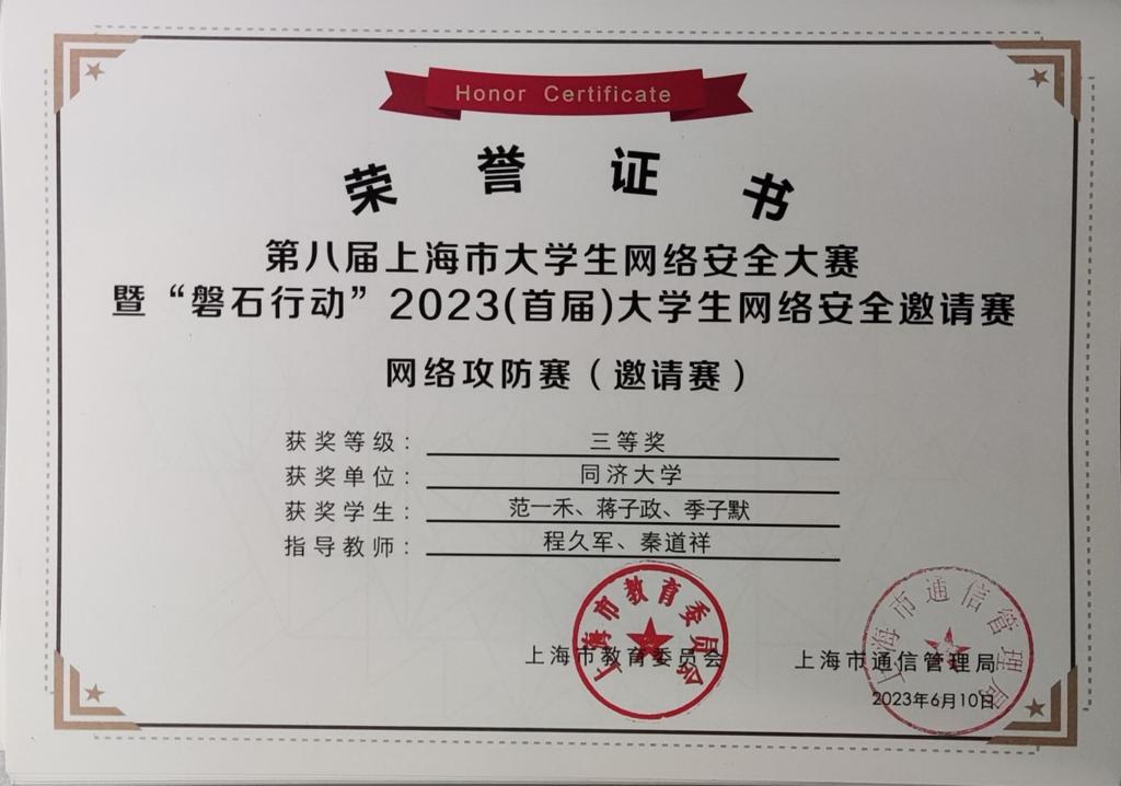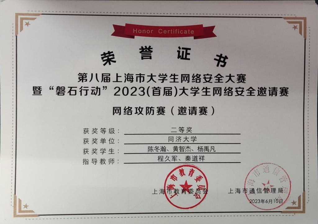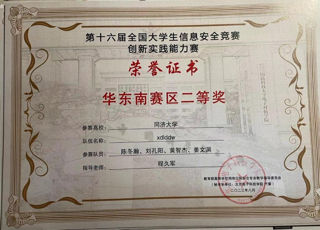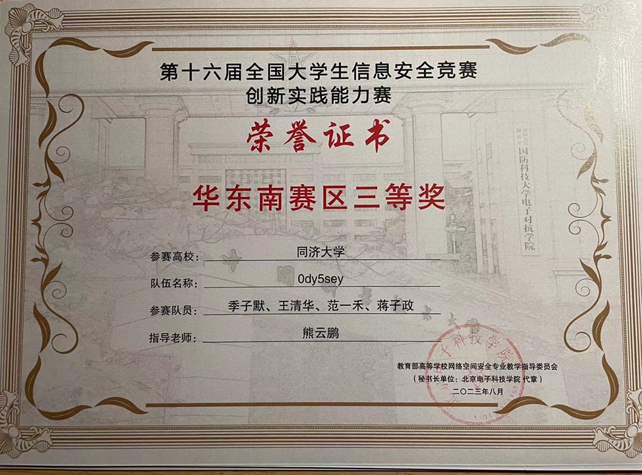 网络安全战队CatTrainingForce的成员们分别在各类信息安全比赛中取得了优异成绩:2023第20届全国大学生信息安全与对抗技术竞赛(一等奖:陈冬瀚;三等奖:季子默);第16届全国大学生信息安全竞赛华东南分区网络安全攻防技术赛(二等奖:陈冬瀚、刘孔阳、姜文渊、黄智杰;三等奖:季子默、蒋子政、范一禾、王清华);第八届上海市大学生网络安全大赛暨“磐石行动”2023(首届)大学生网络安全邀请赛网络攻防赛(上海赛)(二等奖:陈冬瀚、杨禹凡、黄智杰;二等奖:季子默、蒋子政、范一禾);第八届上海市大学生网络安全大赛暨“磐石行动”2023(首届)大学生网络安全邀请赛网络攻防赛(邀请赛)(二等奖:陈冬瀚、杨禹凡、黄智杰;三等奖:季子默、蒋子政、范一禾)。( 文/陈冬瀚 图/季子默 )