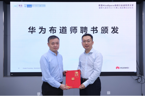 活动现场,中国区人才发展业务校企合作总监褚力行为学院副教授齐鹏颁发华为布道师聘书。华为生态专家为大家分享了第九届华为ICT大赛中国赛最新介绍以及昇思MindSpore赛题解读。