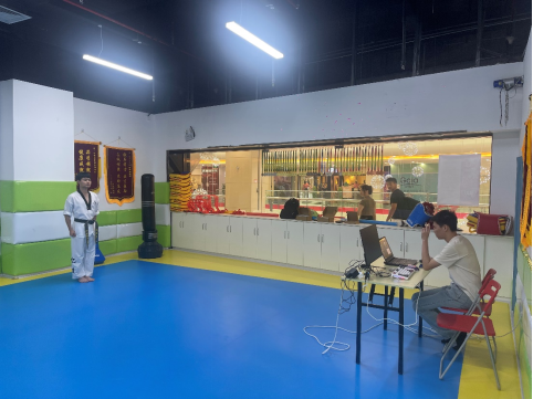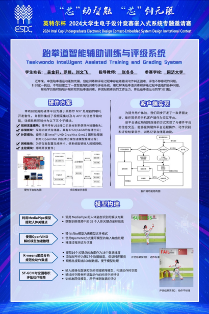获得一等奖的两支代表队分别是来自计算机系的本科生吴金轩、罗楠、刘文飞(指导教师:张冬冬)和来自控制系的本科生王煜程、熊祖绎、陈逸轩(指导教师:蒋磊)。吴金轩、罗楠、刘文飞小组的作品为《跆拳道智能辅助训练与评级系统》。该作品面向跆拳道训练应用,利用嵌入式系统平台进行动作视频采集,借助MediaPipe 中的预训练模型,获取了跆拳道动作训练视频中的 33 个人体关键点坐标信息,并利用ST-GCN(时空图卷积网络)提取出跆拳道动作的时空特征,作为动作的评估指标,从而进一步实现了动作评估功能。此外,团队还借助OpenVINO 工具包对模型推理过程进行了加速,充分利用了哪吒开发套件的强大 AI 计算能力。