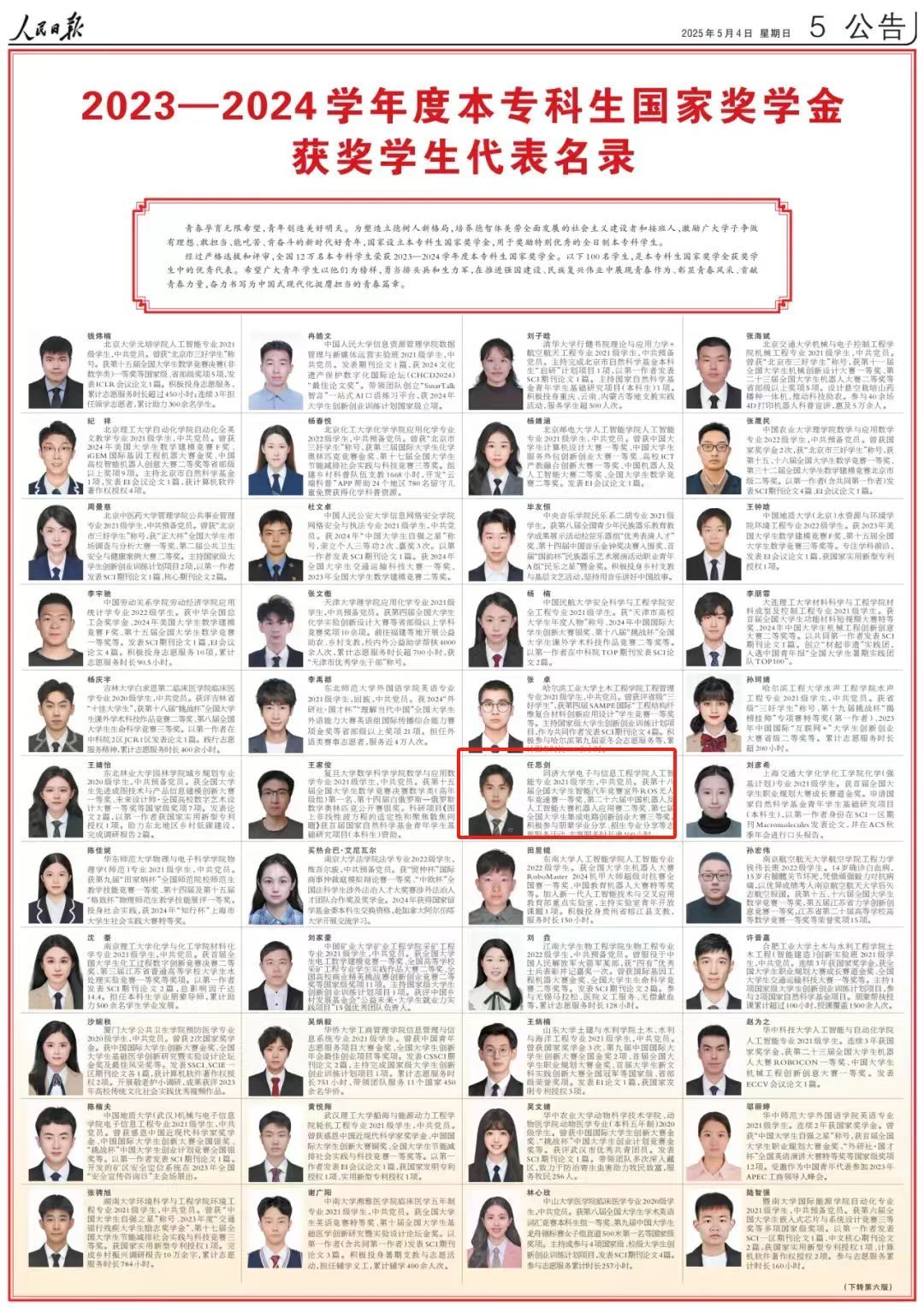 人工智能专业2021级本科生任思剑榜上有名。