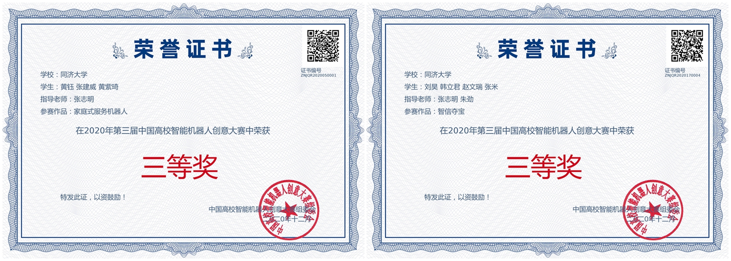 电信学院创新基地面向全校本科生组织参赛,由于比赛时间的推迟,备赛工作受到较大影响,调整组员后的8支参赛队伍经过初赛获得不同赛项的5个决赛资格,在决赛中分别获得一等奖1项、二等奖2项、三等奖2项。决赛获奖队伍来自全国大学生智能汽车竞赛实验室,由教师张志明、朱劲、余有灵指导,本科生黄钰(电子科学与技术)、张建威(电子科学与技术)和黄紫琦(文化产业管理/人文学院)完成的作品——“家庭日常护理服务型机器人”获主题一(创意类机器人)三等奖;杨卓沅(电子科学与技术)、冯翊(自动化)、石雨辰(电子科学与技术)和贾浩东(自动化)组成的“代码全队”获主题三(体感仿人格斗)一等奖;郭思彤(自动化)、陈星熠(电子科学与技术)、朱子辰(自动化)和刘政钦(自动化) 组成的“搏击俱乐部队”获主题三(体感仿人格斗)二等奖;杨帅(测绘工程/测绘与地理信息学院)、罗翊杰(自动化)、袁新航(信息安全)和苏畅(电气工程及其自动化)组成的“TACO队”获主题三(仿人视觉对抗)二等奖;刘昊(自动化)、韩立君(自动化)、赵文瑞(电气工程及其自动化)和张米(电气工程及其自动化) 组成的“智信夺宝队”获专项赛(迷宫夺宝)三等奖。