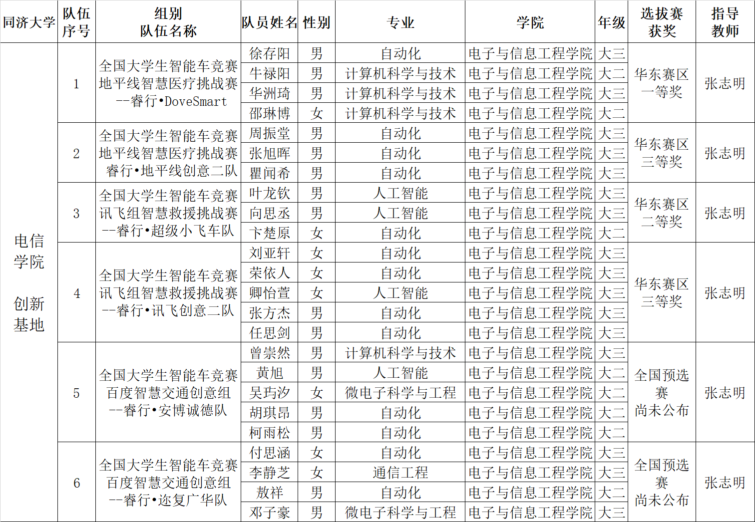 2支队伍分别获得选拔赛华东赛区一等奖和三等奖各一项。其中睿行•DoveSmart队由控制系张志明老师指导,队员为自动化专业的徐存阳同学和计算机科学与技术专业的牛禄阳、华洲琦、邵琳博同学,取得全国总决赛晋级资格。