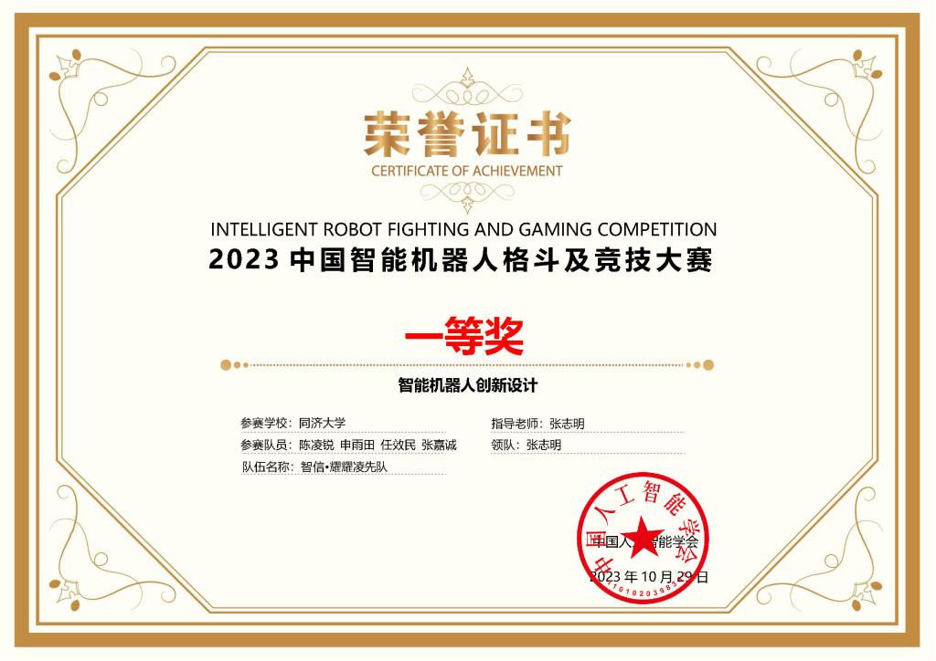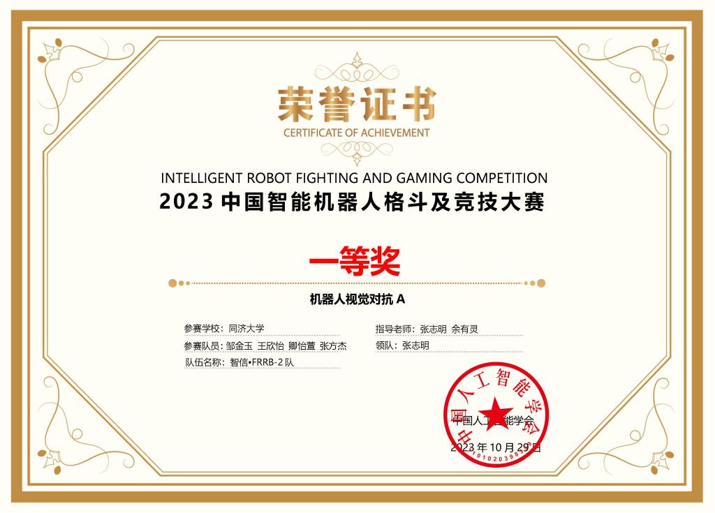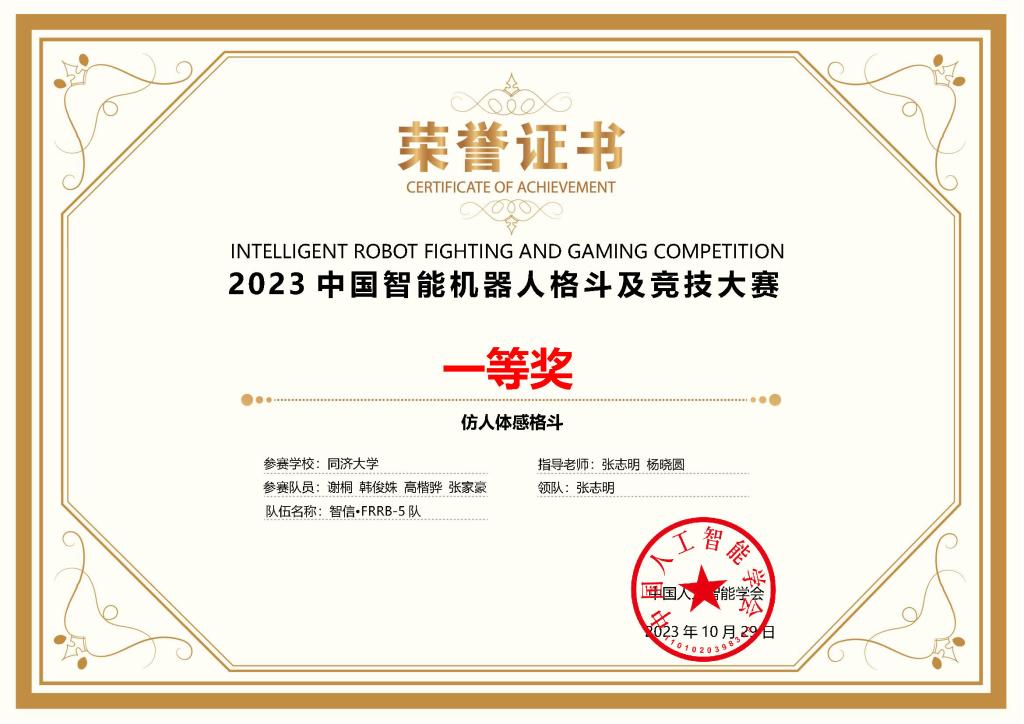 工程实践中心杨晓圆三位老师指导,老队员杨思远、周庚栋、刘梦晓、高远霆、罗翊杰、姚宇阳、张旭晖等同学参与辅助管理。“智信•FRRB-1队”和“智信•FRRB-2队”参加机器人视觉对抗A组,获得两项全国一等奖(亚军和季军);“智信•FRRB-4队”和“智信•FRRB-5队”参加仿人体感格斗组,获得两项全国一等奖;“智信•FRRB-6队”参加开放部件组机器人视觉对抗B组,获得一项全国二等奖(冠军);“智信•FRRB-8队”参加家庭助老机器人竞技,获得一项全国三等奖。