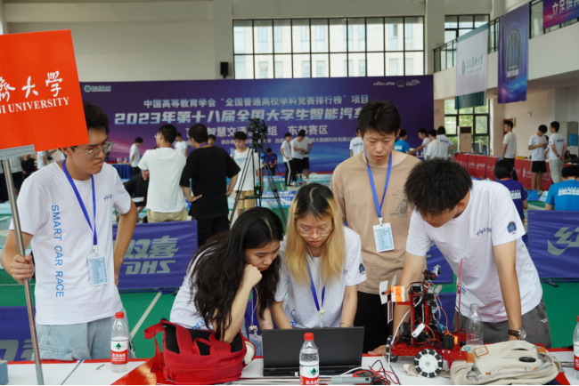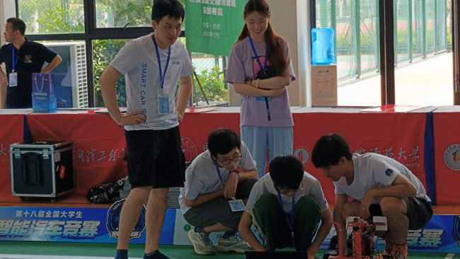 、山东大学等49所高校的近60支参赛队伍321名师生同台竞技,参加线下举办的东部赛区比赛。经过积极备赛,两支队伍获得东部赛区资格,最终由指导教师控制科学与工程系张志明老师领队赴合肥参赛,老队员王聪聪、罗翊杰、杨怡等参与辅助。近三天的比赛过程中虽因多方面因素影响到临场发挥,未能获得更理想成绩,但在全体师生的努力拼搏下,最终克服困难成功完成两轮比赛。睿行•CanCanWorld队由许志康(数据科学与大数据技术)、朱旭堃(计算机科学与技术)、缪其隽(计算机科学与技术)、朱嘉策(计算机科学与技术)、盛夏悦(电气工程及其自动化)等五位同学组成,获得东部赛区二等奖和晋级国赛资格;睿行•到此一游队由田钊丞(汽车学院,车辆工程)、杨宸哲(自动化)、雷彬(自动化)、龚静怡(自动化)、李雨欣(微电子科学与工程)等五位同学组成,获得东部赛区二等奖。